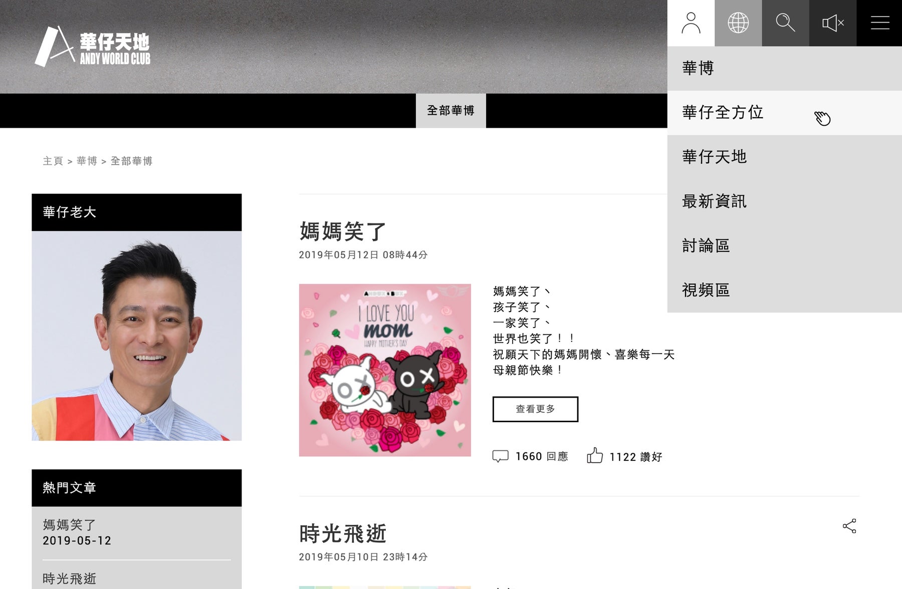 Andy Lau has a very large fan base in Hong Kong, with fans from all different age groups and with so many digital and mobile users nowadays, we have helped launch a fully responsive website which can be viewed on mobiles too. This way fans can access the latest news about Andy easily and conveniently when they’re out and about. We have also redesigned the entire website, developing a blog platform allowing him to update his status and share his thoughts. Plus, we’ve developed a forum, where fans can become a member and share their thoughts and have discussions. We’ve crafted the website design to be more stylish and contemporary, reaching out to the younger fans as well as the older ones. With the new user interface, the user experience is much smoother, allowing fans to read his blog, view related videos and much more, easier.