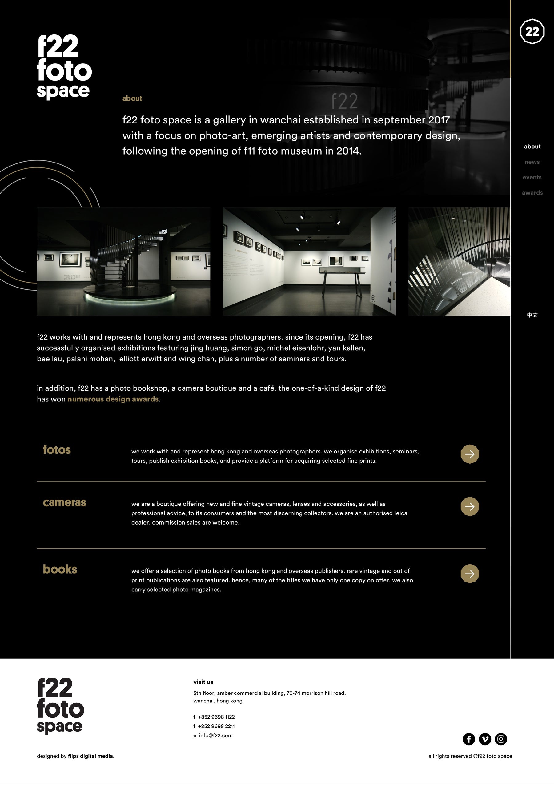 f22 foto space is a gallery established in September 2017, following the opening of f11 Foto museum in 2014. The gallery works with and represents Hong Kong and overseas photographers. The gallery is located in Wanchai with a focus on photo-art, emerging artists and contemporary design and has successfully organised many exhibitions.